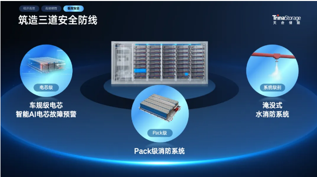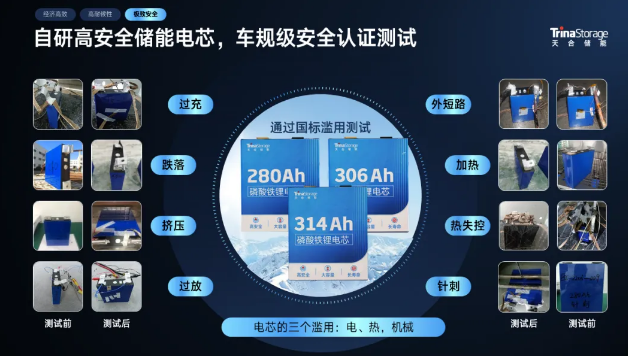 天合储能位列BNEF全球储能产品及系统集成商可融资性TOP5,秉承“预防为主,精准定位、快速隔离”的防护理念,确保储能从芯到系统的全面安全。值得一提的是,天合芯已通过美国UL、IEC和UN等国际安全标准及车规级电芯测试认证,涵盖针刺、挤压等物理极限测试。