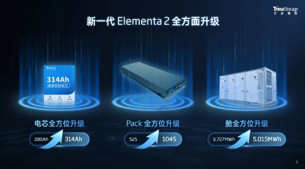 新一代柔性液冷电池舱Elementa 2,采用了自产自研的314Ah储能专用天合芯,该电芯具有超万次循环的寿命。天合储能始终从本征安全角度出发,坚持全栈式管控,确保产品的稳定性和安全性。