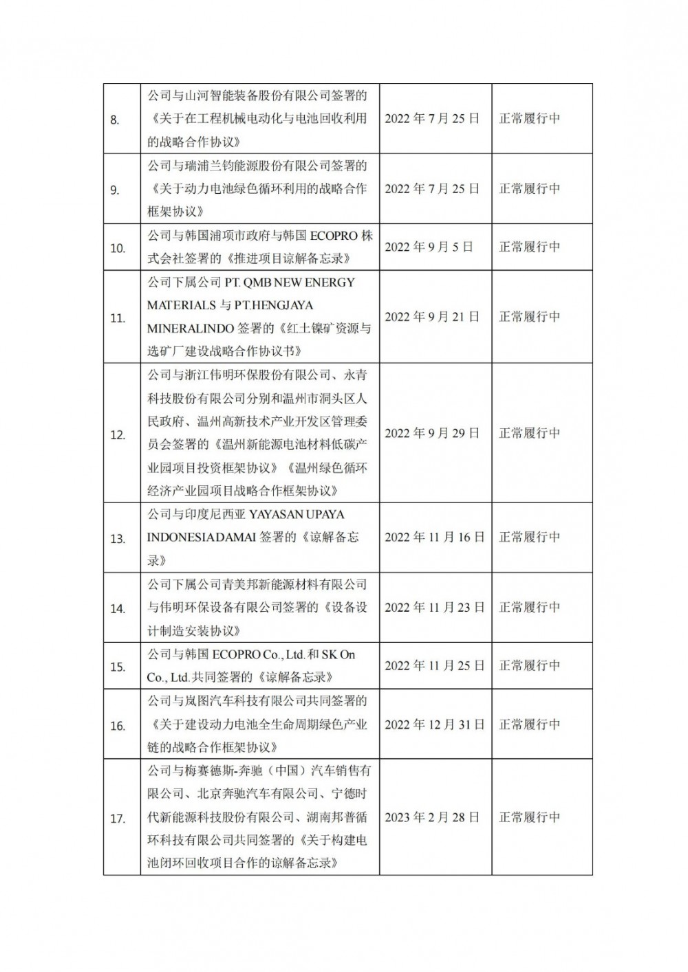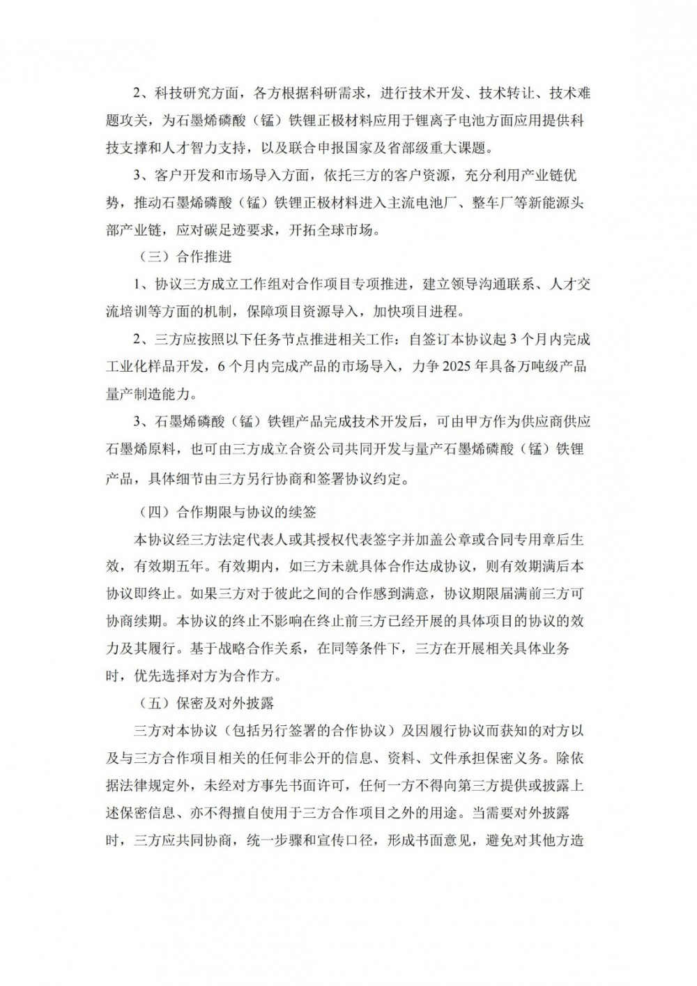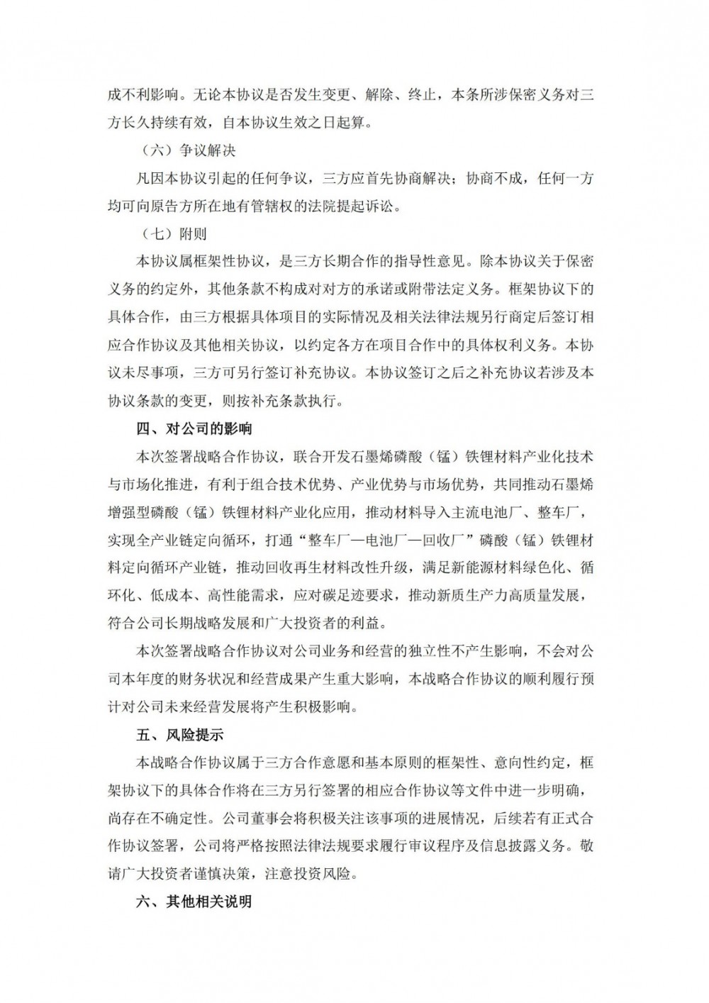 格林美表示,本次签署战略合作协议,联合开发石墨烯磷酸(锰)铁锂材料产业化技术与市场化推进,有利于组合技术优势、产业优势与市场优势,共同推动石墨烯增强型磷酸(锰)铁锂材料产业化应用,推动材料导入主流电池厂、整车厂,实现全产业链定向循环,打通“整车厂—电池厂—回收厂”磷酸(锰)铁锂材料定向循环产业链,推动回收再生材料改性升级,满足新能源材料绿色化、循环化、低成本、高性能需求,应对碳足迹要求,推动新质生产力高质量发展,符合公司长期战略发展和广大投资者的利益。