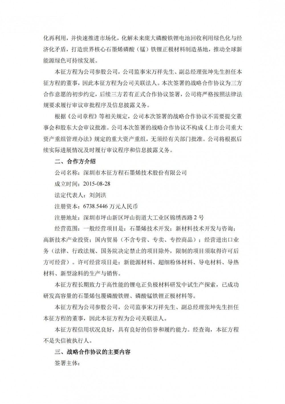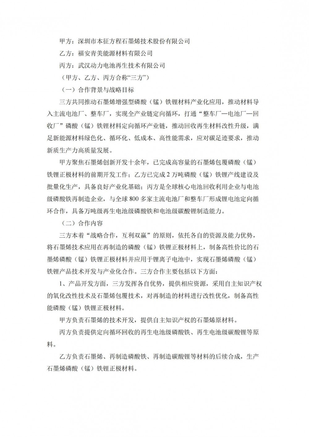 7月10日,格林美发布公告称,公司下属控股子公司福安青美能源材料有限公司、武汉动力电池再生技术有限公司与深圳市本征方程石墨烯技术股份有限公司(以下简称“本征方程”)经友好协商共同签署了《关于联合开发石墨烯磷酸(锰)铁锂材料产业化技术与市场化推进的战略合作协议》(以下简称“战略合作协议”)。