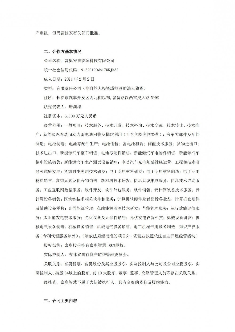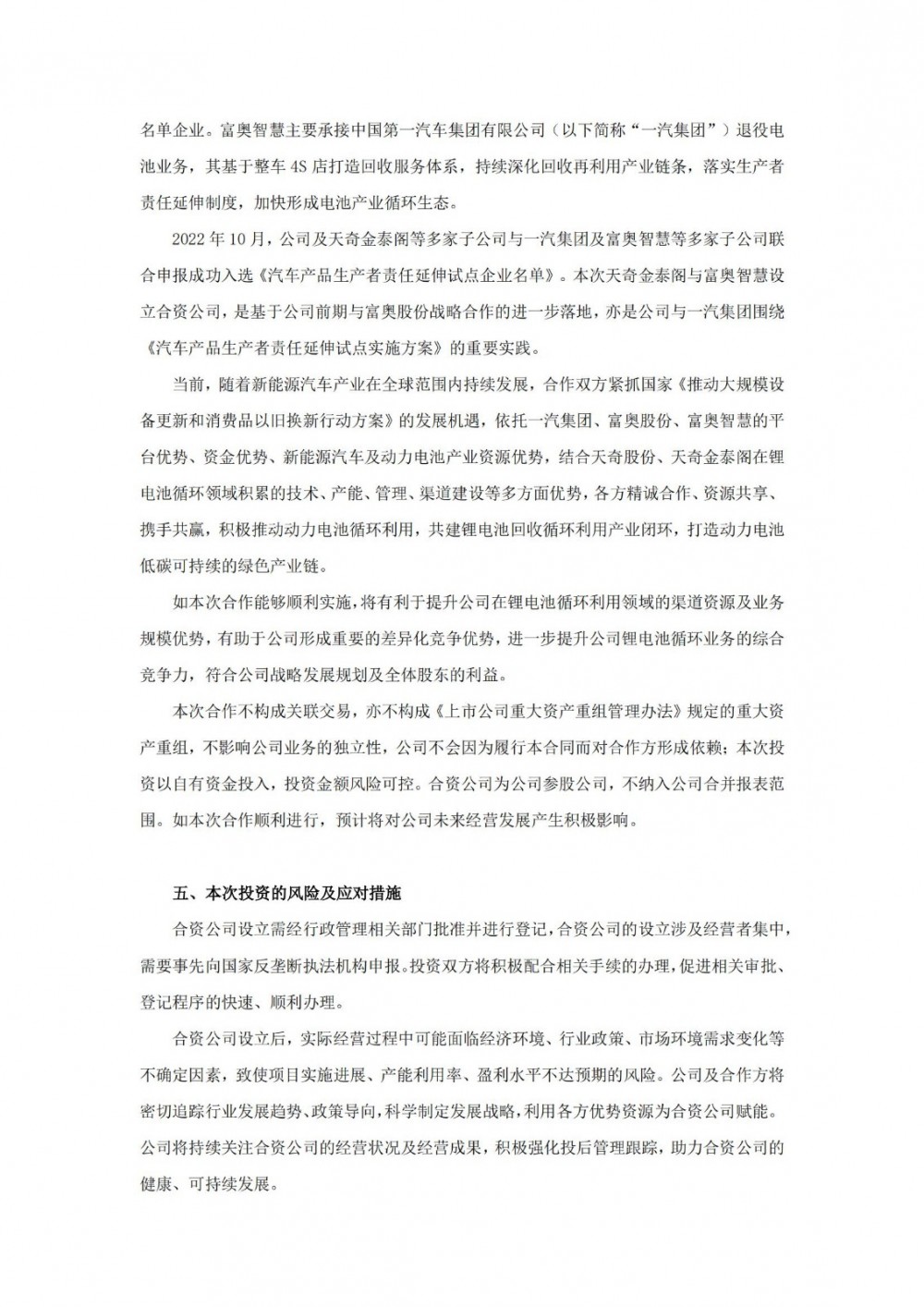 公告中提到,本次合作方富奥智慧为富奥股份的全资子公司,其致力于新能源电池全生命周期运营和价值创造,为工信部颁布的符合《新能源汽车废旧动力蓄电池综合利用行业规范条件》的白名单企业。富奥智慧主要承接中国第一汽车集团有限公司(以下简称“一汽集团”)退役电池业务,其基于整车 4S 店打造回收服务体系,持续深化回收再利用产业链条,落实生产者责任延伸制度,加快形成电池产业循环生态。