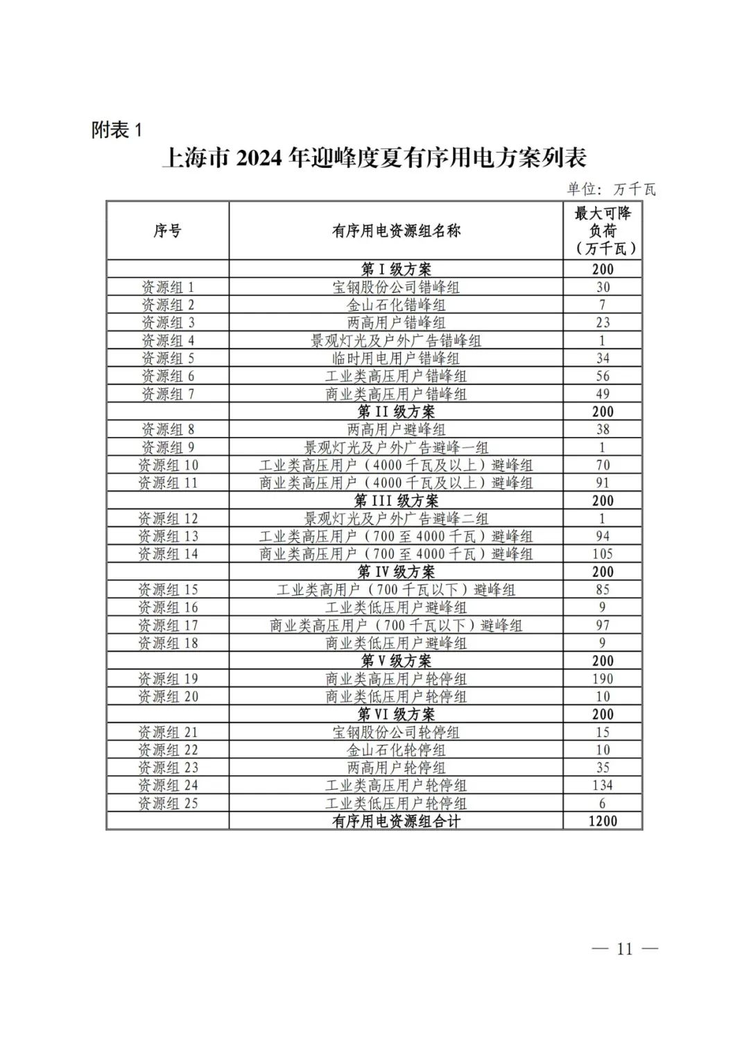 附表:1.上海市2024年迎峰度夏有序用电方案列表