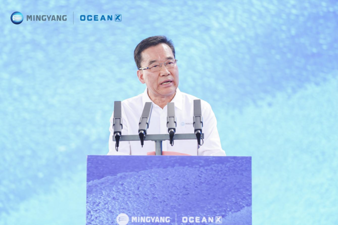 仪式上,明阳集团党委书记、董事长张传卫致辞。他表示,作为全球海上风电市占率第一的领军企业,明阳集团一直在向海图强、挺进深蓝上保持战略定力和巨大投入。近年来,明阳集团携手中国三峡、中国海油,连续创造三项世界第一的海上漂浮式风电平台技术。明阳坚持创新,久久为功,历时五年,勇于攻关,抢占科技制高点,突破深远海大容量漂浮式风电平台核心关键技术,成功研制明阳天成号,通过装备创新拓展海洋能源的可开发规模,降低海上风电建造成本和度电成本,为向海图强筑梦深蓝发展关键绿色新质生产力贡献明阳的智慧和力量。