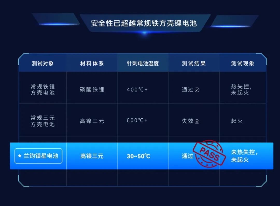 相较铁锂体系,对比可以发现,兰钧镇星电池的安全性已超越常规铁方壳锂电池: