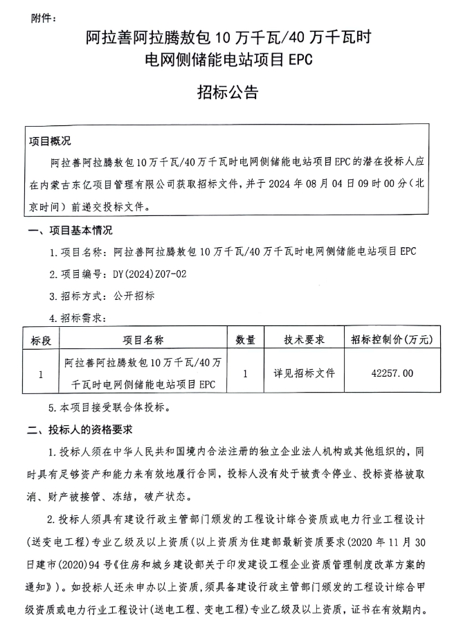 日前,内蒙古阿拉善阿拉腾敖包10万千瓦/40万千瓦时电网侧储能电站项目EPC招标公告发布,项目招标人为国众(拉善盟)能源有限公司,资金源于企业自筹,共42257万元,折合单价1.056元/Wh。