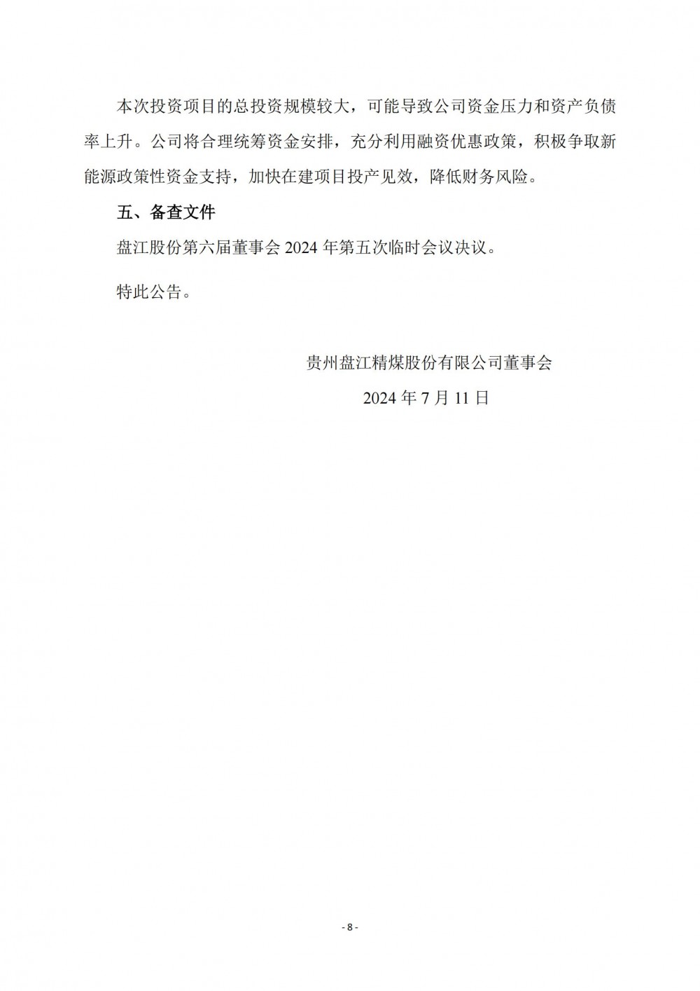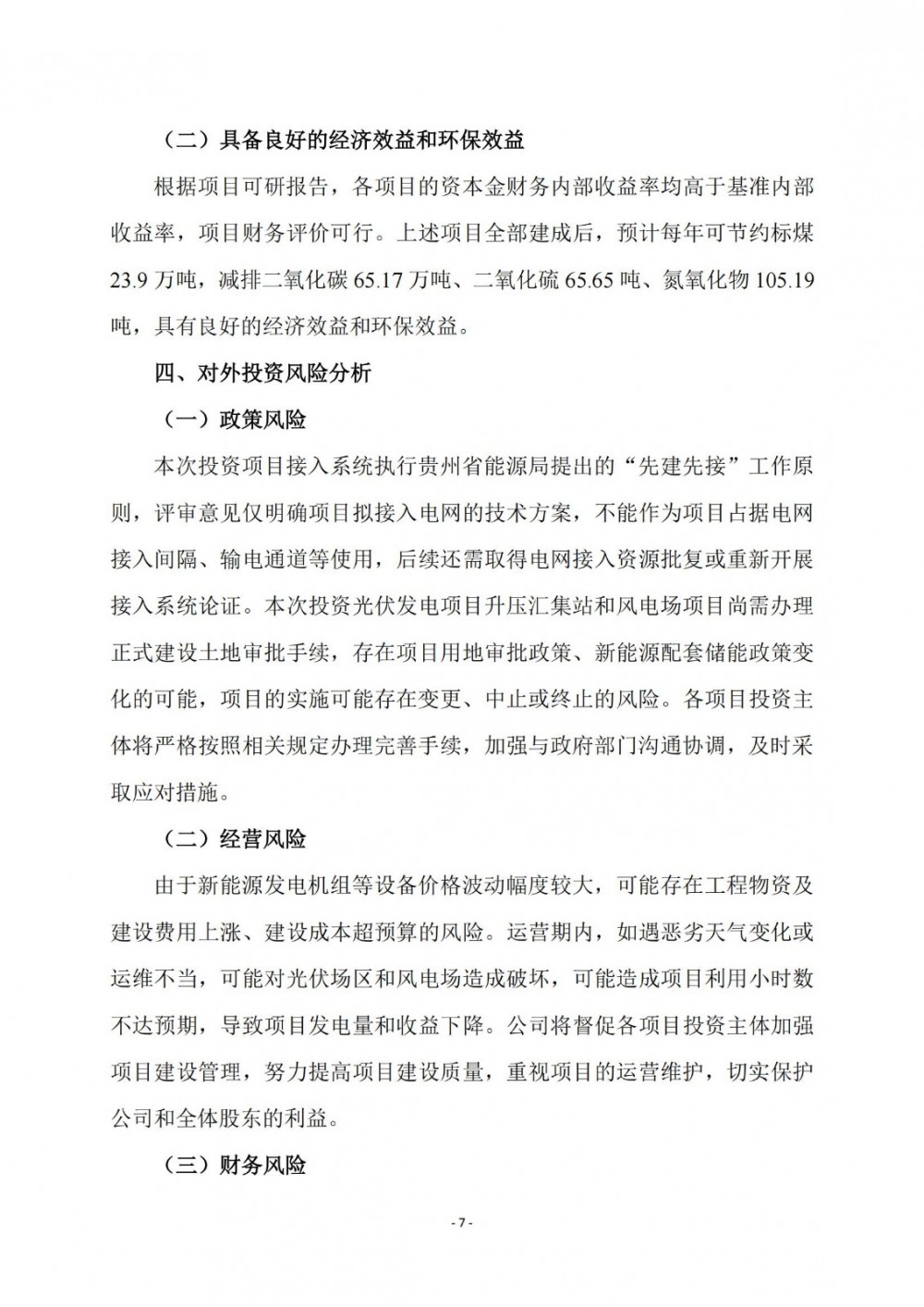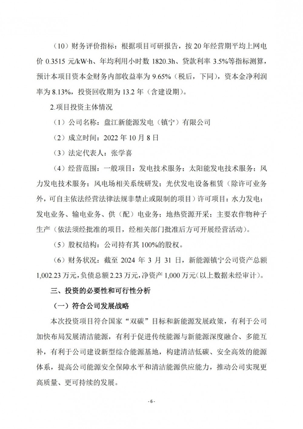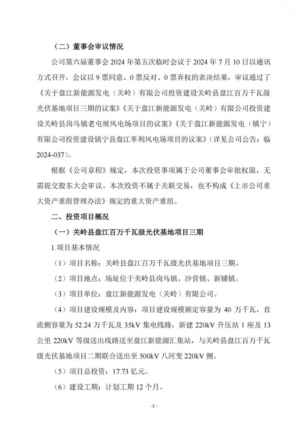 7月12日,盘江股份发布公告称,公司围绕建设新型综合能源基地,加快布局发展清洁能源,拟通过控股子公司盘江新能源发电(关岭)有限公司(以下简称“新能源关岭公司”)投资建设关岭县盘江百万千瓦级光伏基地项目三期(建设安装容量52.24万千瓦)和关岭县岗乌镇老屯坡风电场项目(建设安装容量10万千瓦),总投资分别为17.73亿元、54,561万元;通过全资子公司盘江新能源发电(镇宁)有限公司(以下简称“新能源镇宁公司”)投资建设镇宁县盘江革利风电场项目(建设安装容量5万千瓦),总投资为27,917万元。前述项目合计建设安装容量67.24万千瓦,总投资合计约25.98亿元。
