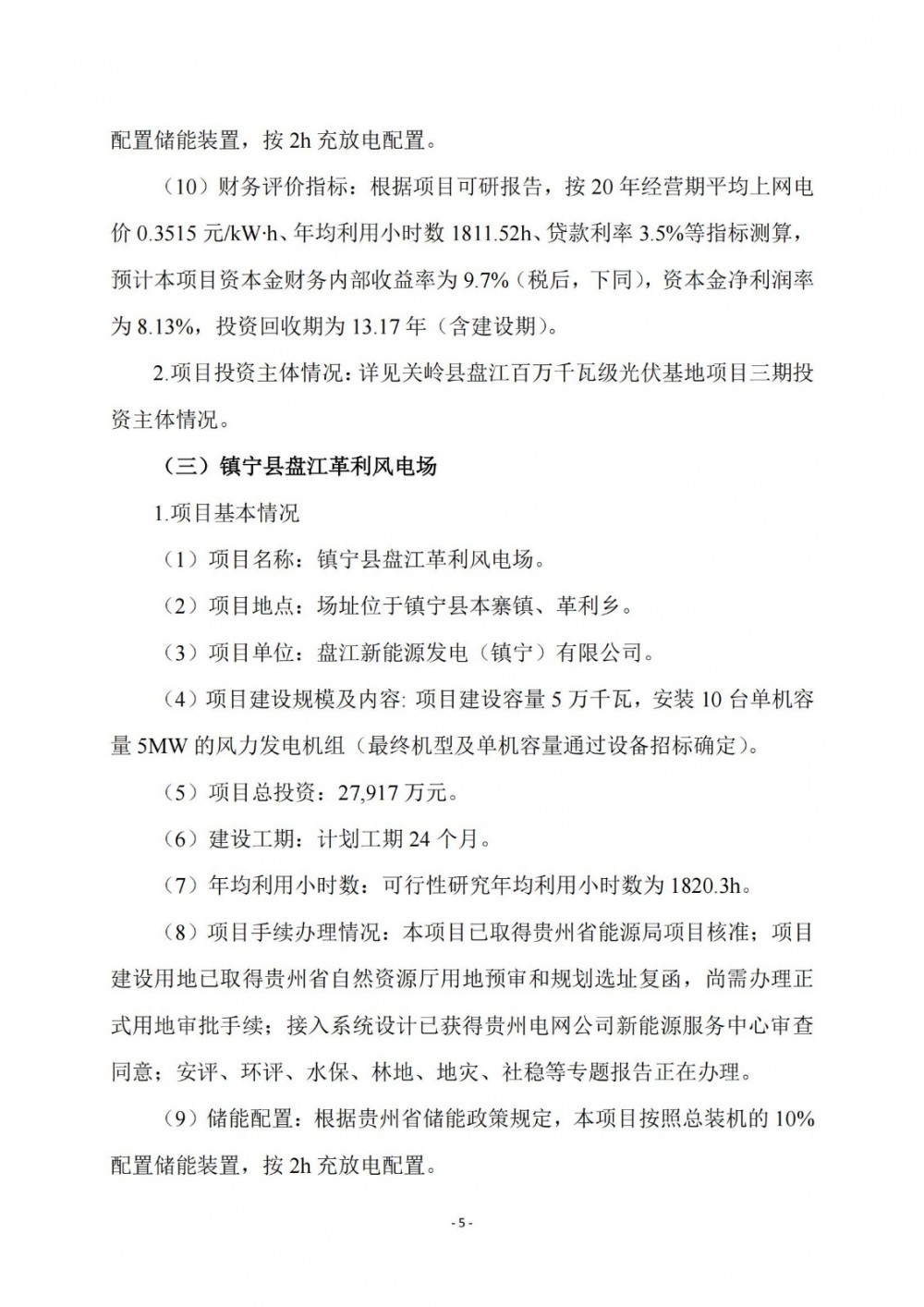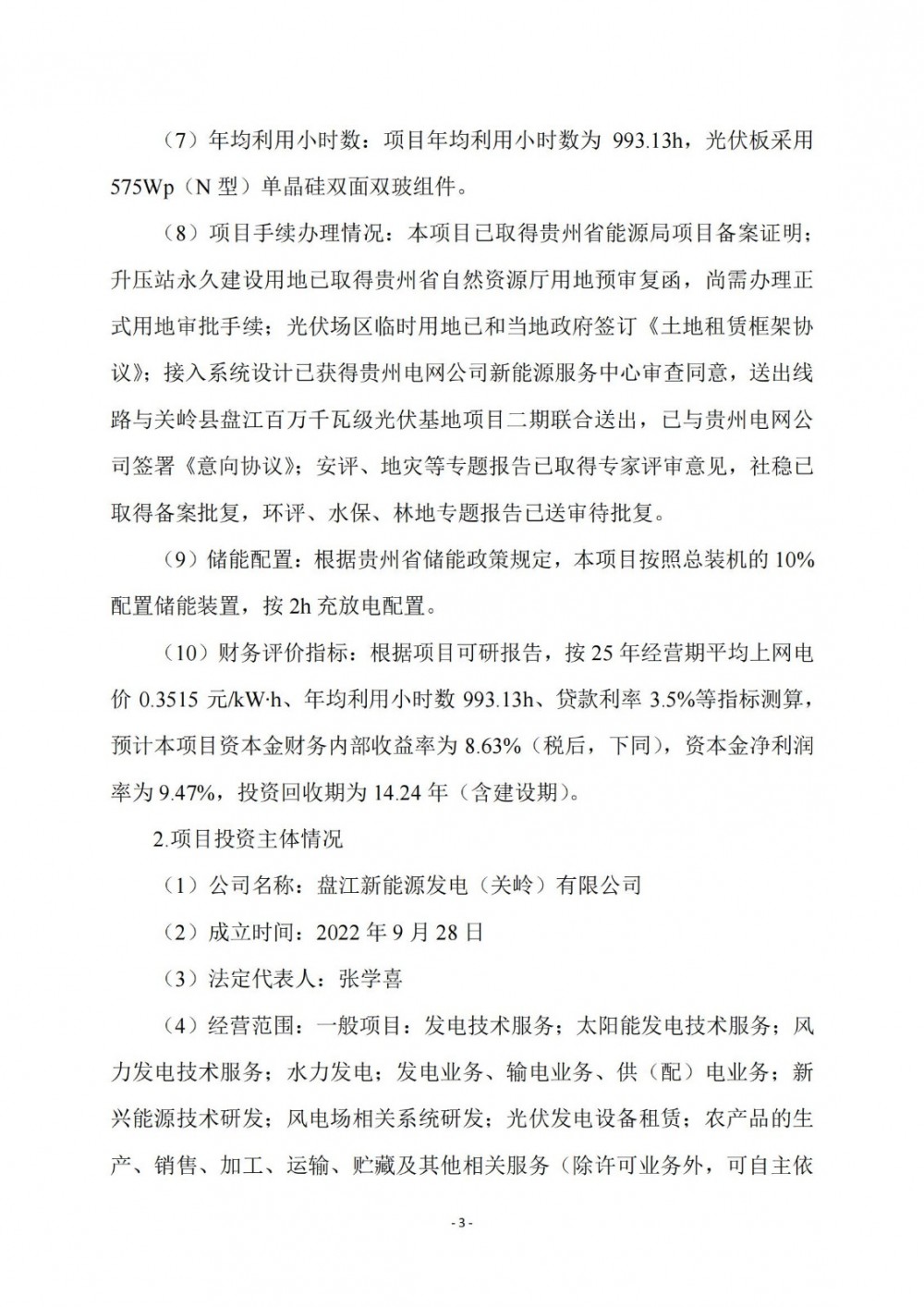 其中关岭县盘江百万千瓦级光伏基地项目三期,投资主体为盘江新能源发电(关岭)有限公司。该项目总投资17.73亿元,建设规模额定容量为40万千瓦,直流侧容量为52.24万千瓦。本项目按照总装机的10%配置储能装置,按2h充放电配置。该项目年均利用小时数为993.13h,光伏板采用575Wp(N型)单晶硅双面双玻组件。根据项目可研报告,按25年经营期平均上网电价0.3515元/kWh、年均利用小时数993.13h、贷款利率3.5%等指标测算,预计本项目资本金财务内部收益率为8.63%(税后,下同),资本金净利润率为9.47%,投资回收期为14.24年(含建设期)。