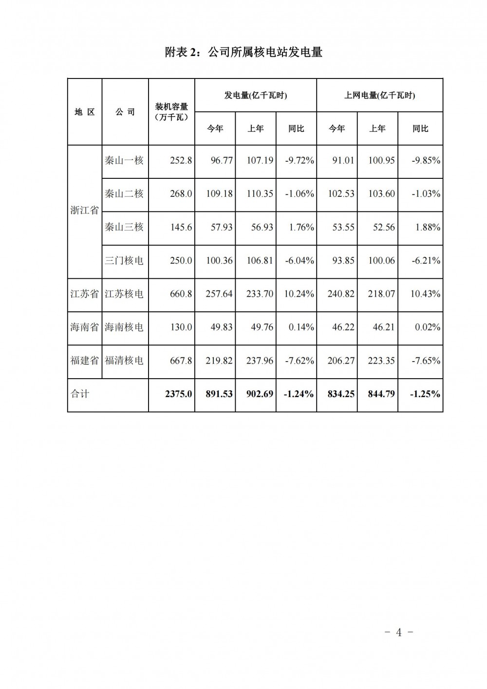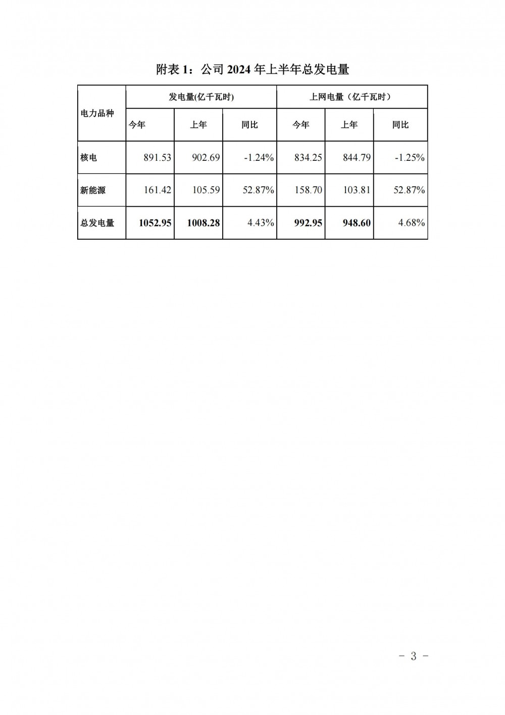 截至2024年6月30日,公司2024年上半年累计商运发电量为1052.95亿千瓦时,同比增长4.43%;上网电量为992.95亿千瓦时,同比增长4.68%。