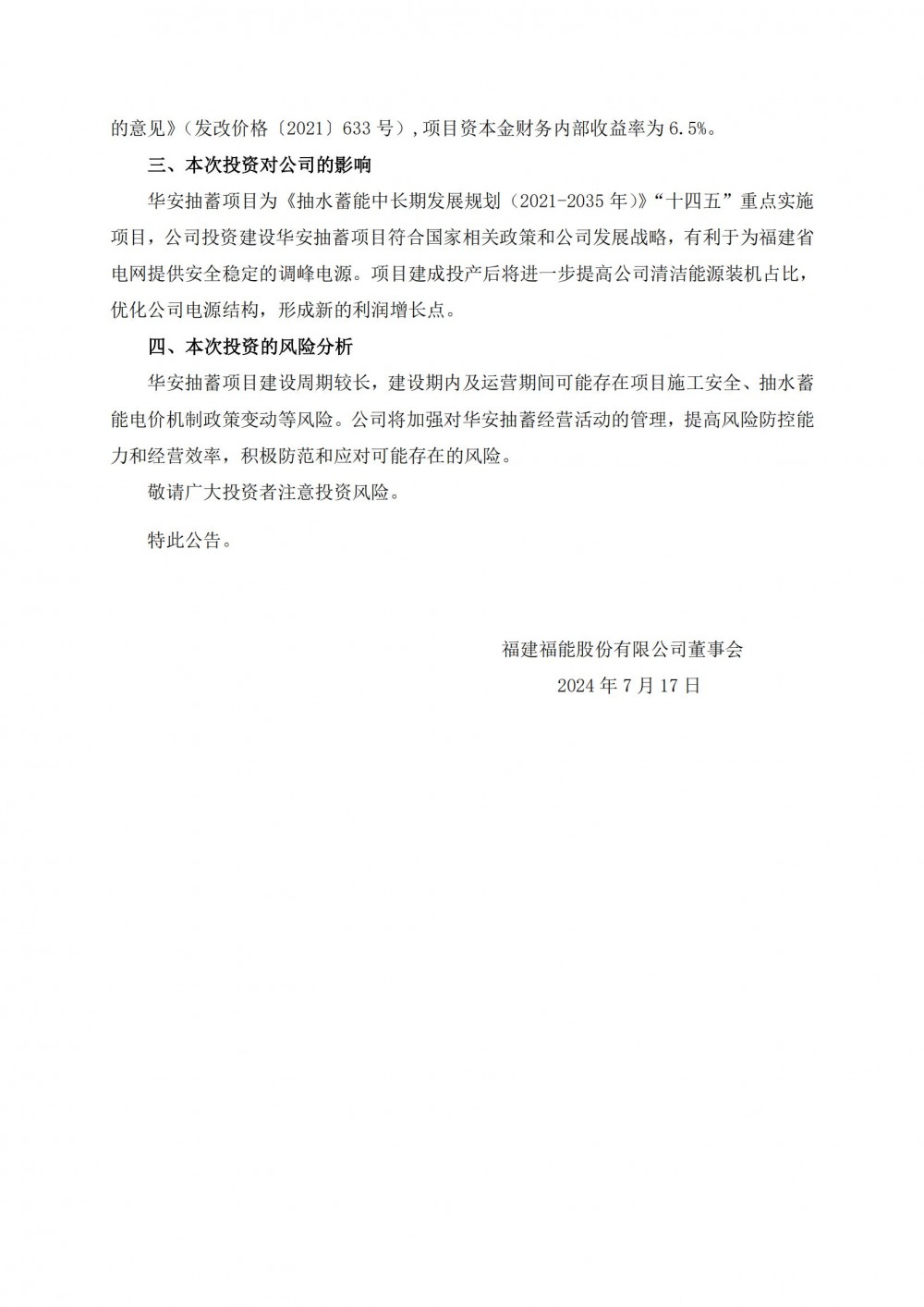 7月16日,福能股份发布《关于投资建设福建省华安抽水蓄能电站项目的公告》。