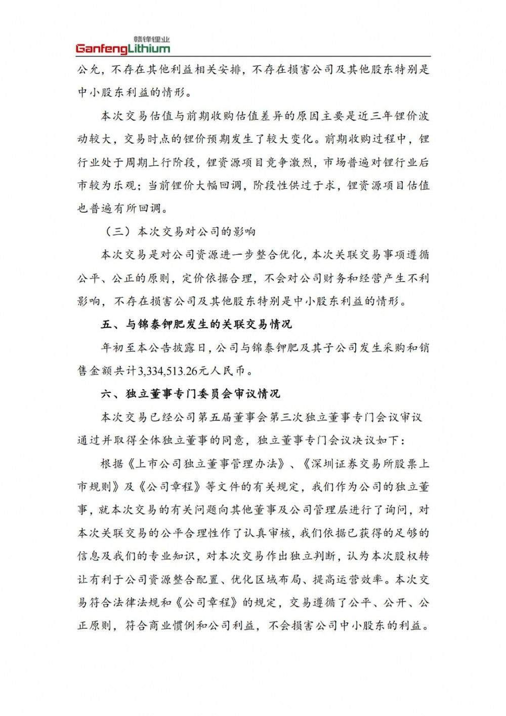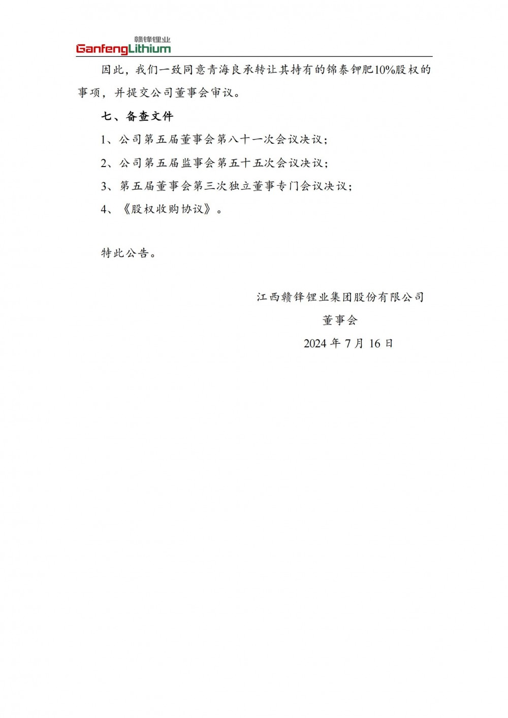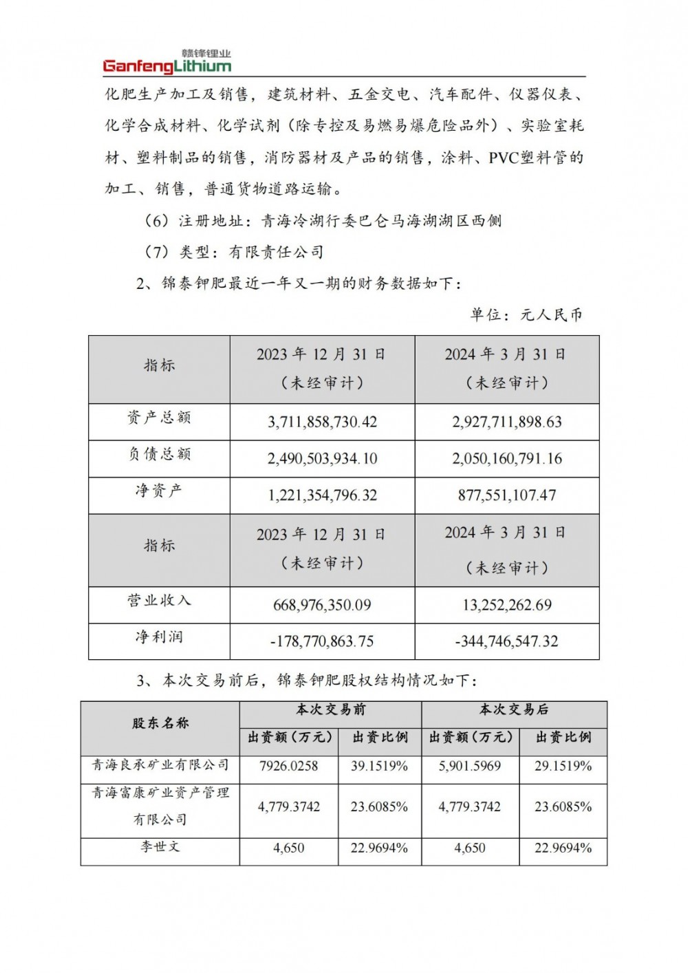 近日,赣锋锂业发布公告称,公司同意全资子公司青海良承矿业有限公司(以下简称“青海良承”)以4亿元人民币的价格向青海聚锂新能源科技有限责任公司(以下简称“青海聚锂”)转让青海良承持有的青海锦泰钾肥有限公司(以下简称“锦泰钾肥”)10%的股权。