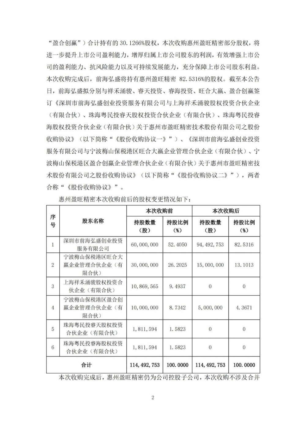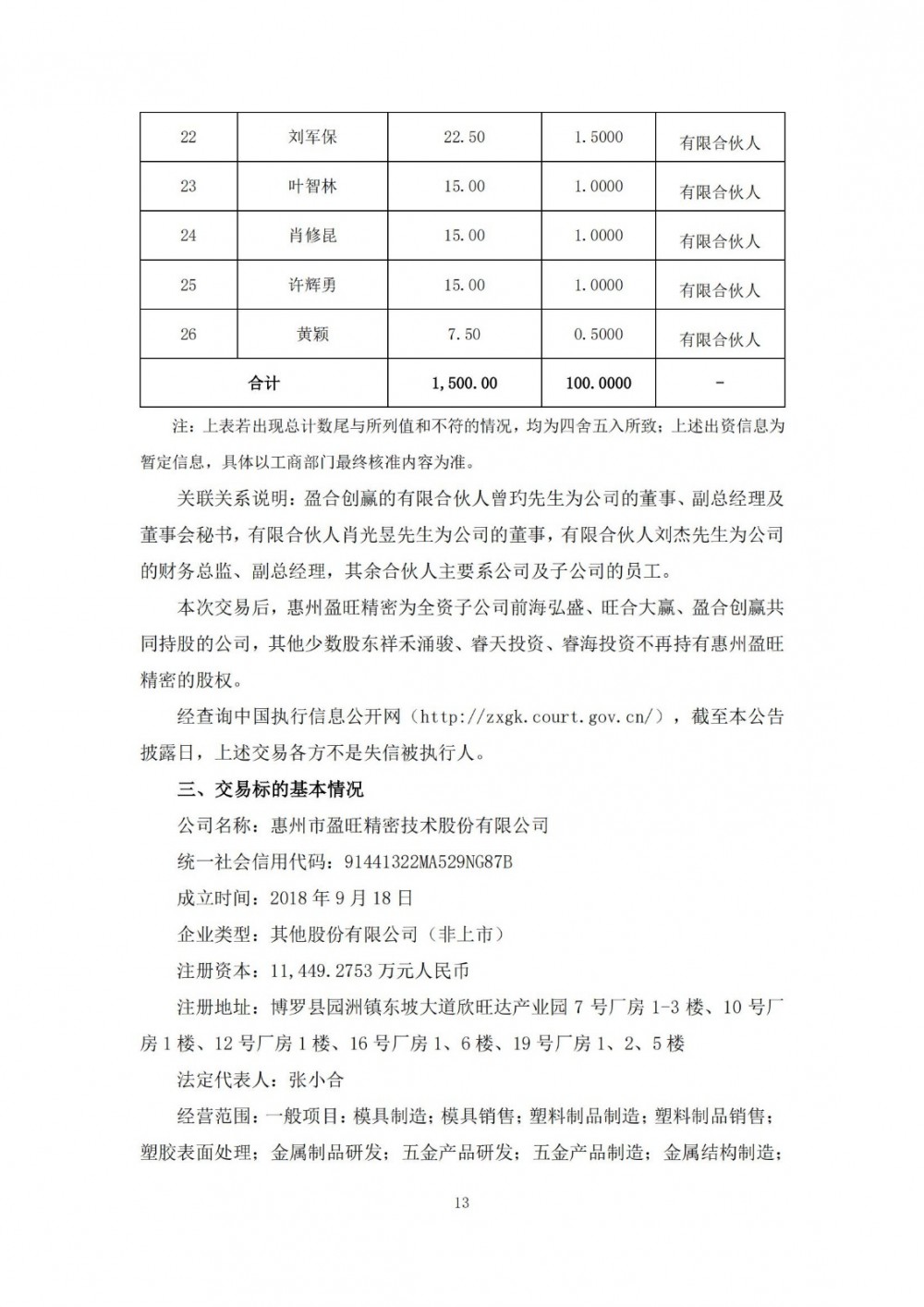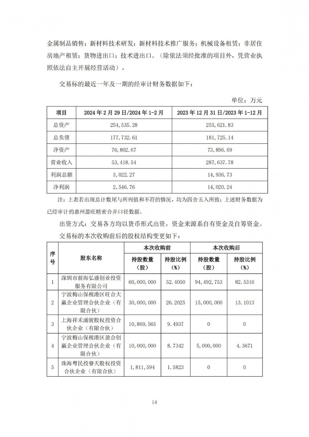公告显示,惠州盈旺精密是一家专业从事精密结构件的研发、生产和销售的国家级高新技术企业,具有较强的盈利能力,行业地位领先。2022年度和2023年度,惠州盈旺精密的收入分别为25.30亿元和28.76亿元,净利润分别为1.30亿元和1.40亿元。