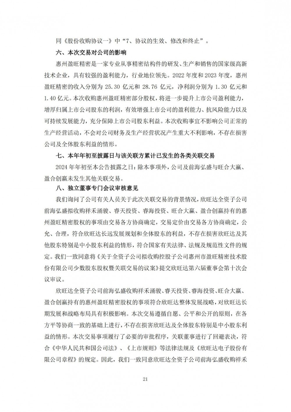 欣旺达表示,本次收购惠州盈旺精密部分股权,将进一步提升上市公司盈利能力,增厚归属上市公司股东的利润,有效增强上市公司的盈利能力、抗风险能力以及可持续发展能力,充分保障上市公司股东利益。本次收购事宜不影响公司正常的生产经营活动,不会对公司财务及生产经营状况产生重大不利影响,不存在损害公司及全体股东利益的情形。