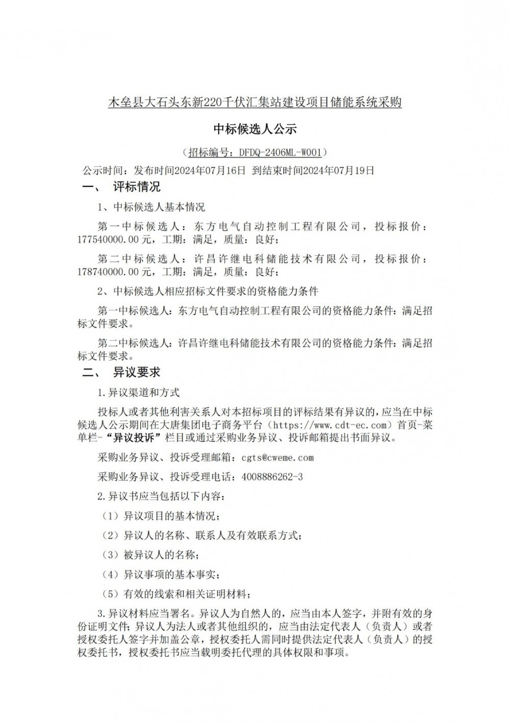 第一中标候选人为东方电气自动控制工程有限公司,投标报价17754万元,折合单价0.888元/Wh;第二中标候选人为许昌许继电科储能技术有限公司,投标报价17874万元,折合单价0.894元/Wh。