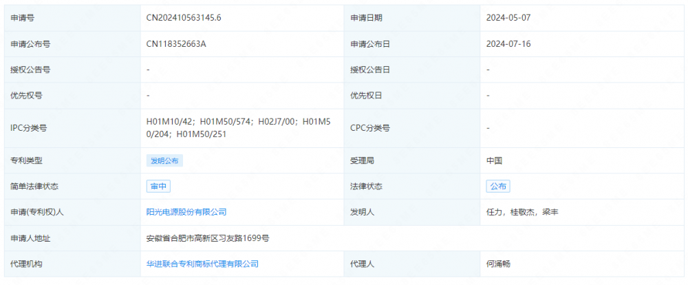据储能界了解到,企查查显示,阳光电源申请一项名为“储能系统及其控制方法”的专利,申请公布号CN118352663A,申请公布日期为2024年7月16日。