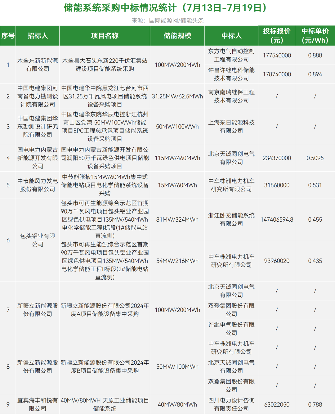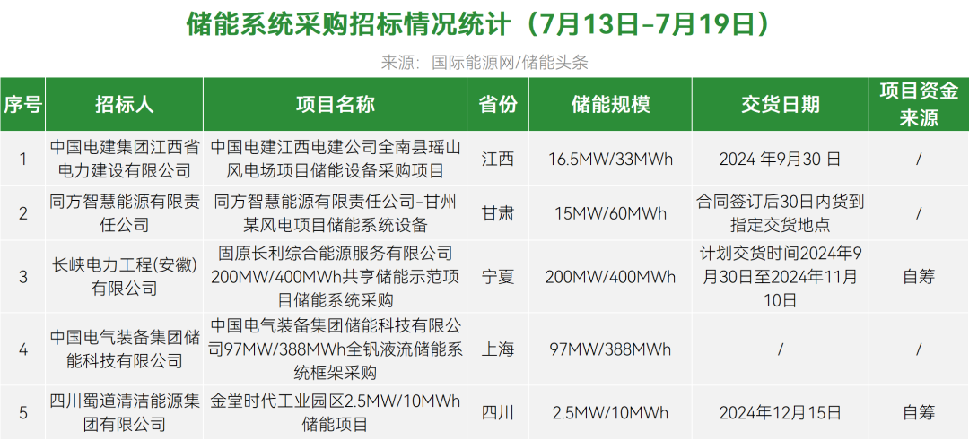 7个储能EPC中标项目中标单价0.578-1.943元/Wh