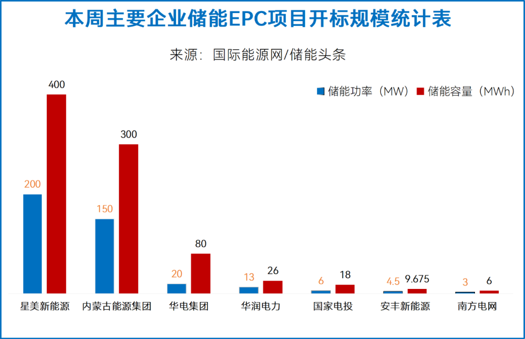 华电集团有1个项目开标,总规模20MW/80MWh,水电九局、华东勘测设计研究院入围;