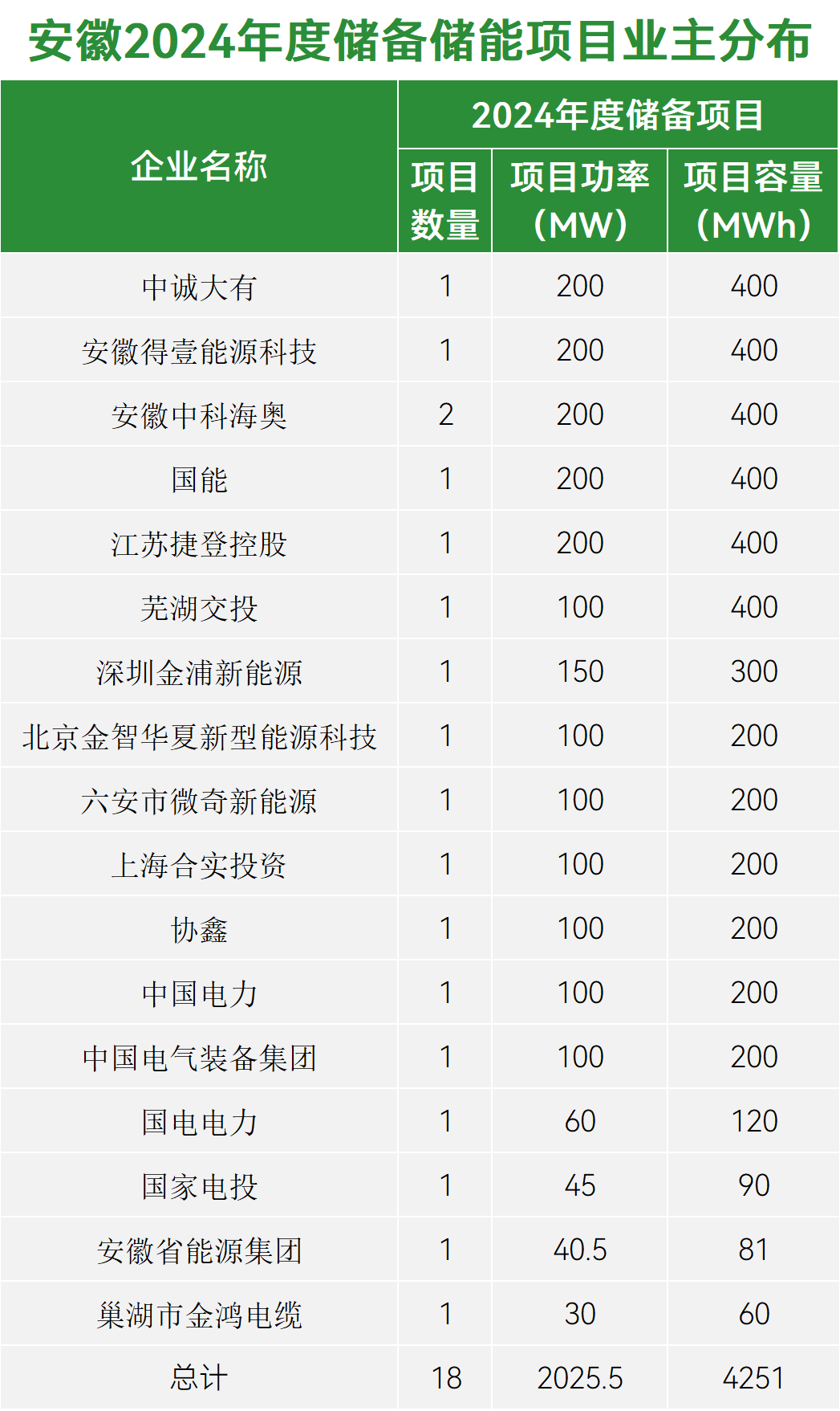 2024年度新型储能储备项目18个,总容量2025.5MW/4251MWh。涉及皖南风电、中诚大有、国能 、芜湖交投、协鑫、中国电力等企业。