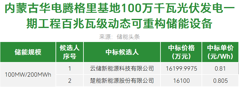第一中标候选人为云储新能源科技有限公司,投标报价16199.9975万元,折合单价0.81元/Wh;第二中标候选人为楚能新能源股份有限公司,投标报价16100万元,折合单价0.805元/Wh。
