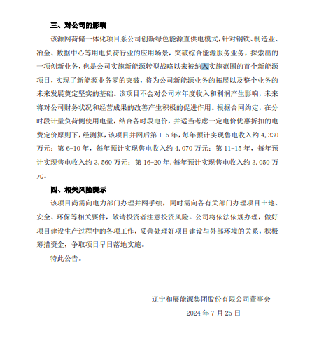 公告显示,2024年7月23日,河南省发展和改革委员会下达《关于实施第二批源网荷储一体化项目的通知》(豫发改能综〔2024〕431号),辽宁和展能源集团股份有限公司二级控股子公司河南九展新能源有限公司签订的源网荷储一体化能源开发项目被纳入第二批实施范围。