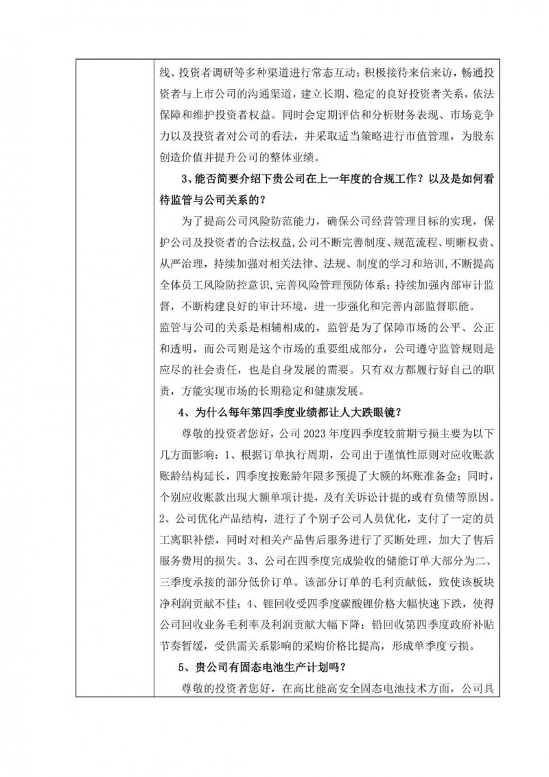 南都电源2023年度四季度较前期亏损主要为以下几方面影响:1、根据订单执行周期,公司出于谨慎性原则对应收账款账龄结构延长,四季度按账龄年限多预提了大额的坏账准备金;同时,个别应收账款出现大额单项计提,及有关诉讼计提的或有负债等原因。2、公司优化产品结构,进行了个别子公司人员优化,支付了一定的员工离职补偿,同时对相关产品售后服务进行了买断处理,加大了售后服务费用的损失。3、公司在四季度完成验收的储能订单大部分为二、三季度承接的部分低价订单。该部分订单的毛利贡献低,致使该板块净利润贡献不佳;4、锂回收受四季度碳酸锂价格大幅快速下跌,使得公司回收业务毛利率及利润贡献大幅下降;铅回收第四季度政府补贴节奏暂缓,受供需关系影响的采购价格比提高,形成单季度亏损。