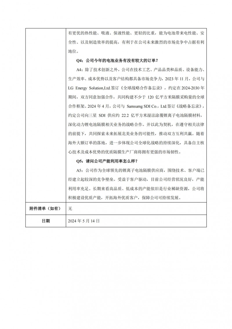 设备方面,星源材质去年全球首发了第五代超级湿法线单线,在生产效率、品质、智能化、低碳化等指标方面刷新了行业标准,干法隔膜产线也迭代至第六代产线。公司将不断推出更加先进、高性能的锂电池隔膜产品,满足市场的不断变化和需求,为新能源产业的持续发展做出更大的贡献。