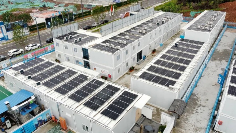 天府新区保障房项目新能源临建系统融合了光伏发电、储能系统两个部分,在临建屋面安装了327块585W单晶硅光伏板,装机容量191.3Kwp,预计年省电约13.39万KWh,节约碳排放约120吨,约等于63吨标准煤。