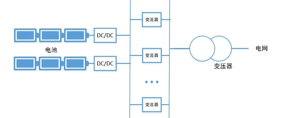 集散式储能是一种将多个电池簇并联运行的方式,每个电池簇经过直流变压器(DC/DC)变成一致的电压以后在直流侧进行并联,直流电汇流后通过PCS储能变流器转换成交流,不同于集中式的是集散式在每个电池簇使用了DC/DC。