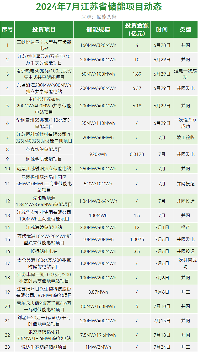 7月,江苏省共有23个储能项目有了新进展,储能规模为1935.3MW/3990.03MWh,明确投资金额51.2603亿元。
