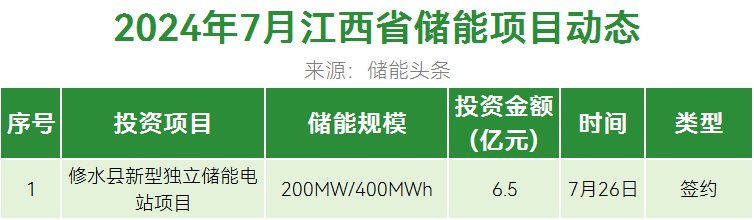 江西有1个储能电站项目更新了动态。储能规模为200MW/400MWh,明确投资金额6.5亿元。