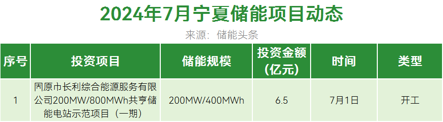 7月1日,宁夏一储能电站项目开工,该项目为固原市长利综合能源服务有限公司200MW/800MWh共享储能电站示范项目(一期),一期项目总容量200MW/400MWh,投资约为6.5亿元。
