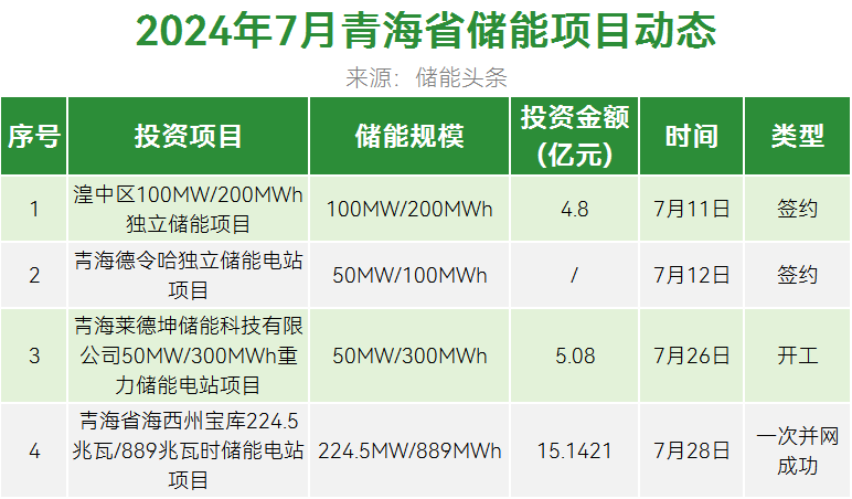 7月,青海省共有4个储能项目更新了动态,储能规模为424.5MW/1489MWh,明确投资金额25.0221亿元。