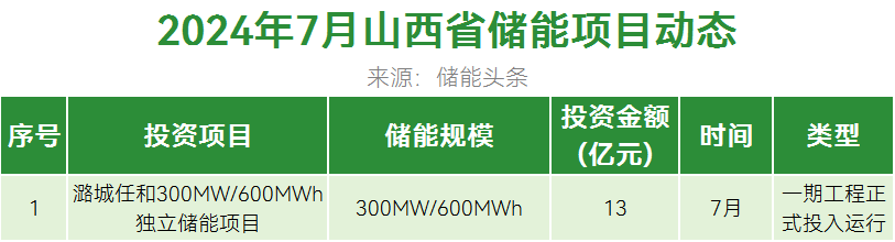 山西有1个储能电站项目更新了动态。储能规模为300MW/600MWh,明确投资金额13亿元。
