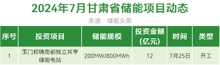 甘肃有1个储能电站项目更新了动态。储能规模为200MW/800MWh,明确投资金额12亿元。