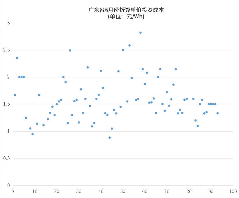 从备案投资金额来看,广东储能电站折算投资成本范围在1.20元MWh-2.3元/Wh,多数分布在1.20元/Wh-2.00 元/Wh之间。