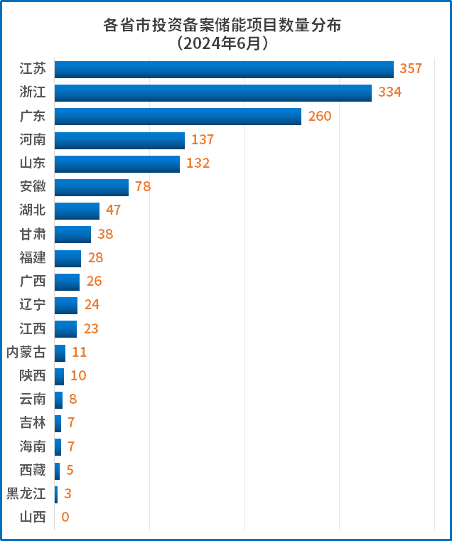从各省储能备案项目个数来看,6月份全国19个省份完成备案数量是1535个,其中江苏省备案储能建设项目总量357个,数量位居全国第一;其次是浙江省和广东,分别备案334个、260个储能项目。