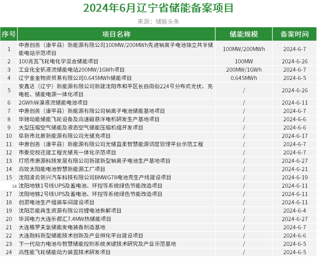 6月,辽宁共24个储能备案项目,其中多以储能产业项目为主。