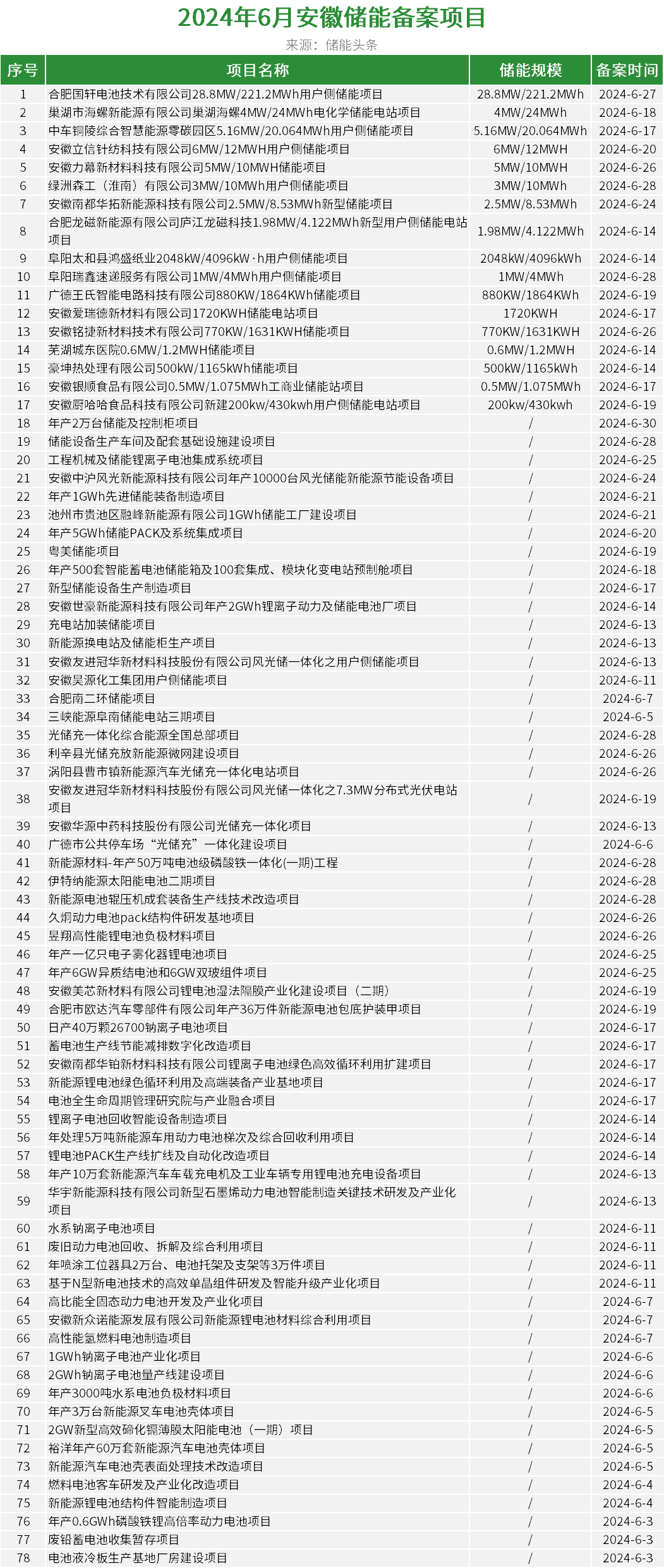 据统计,6月,安徽备案储能项目78个。新建储能电站规模62.94MW/327.10MWh。