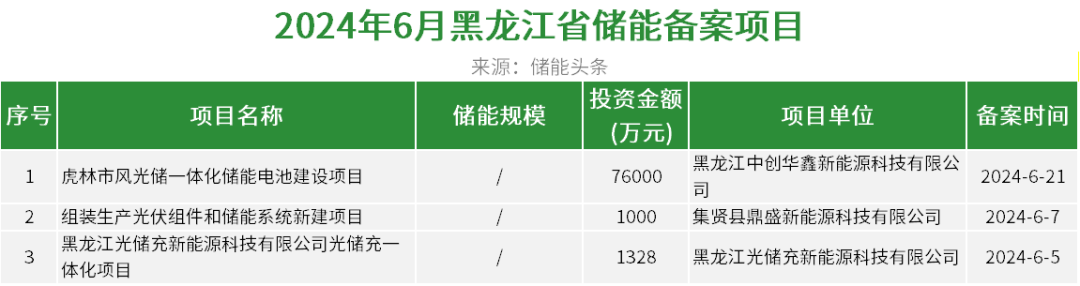 黑龙江6月份储能备案项目有3个。