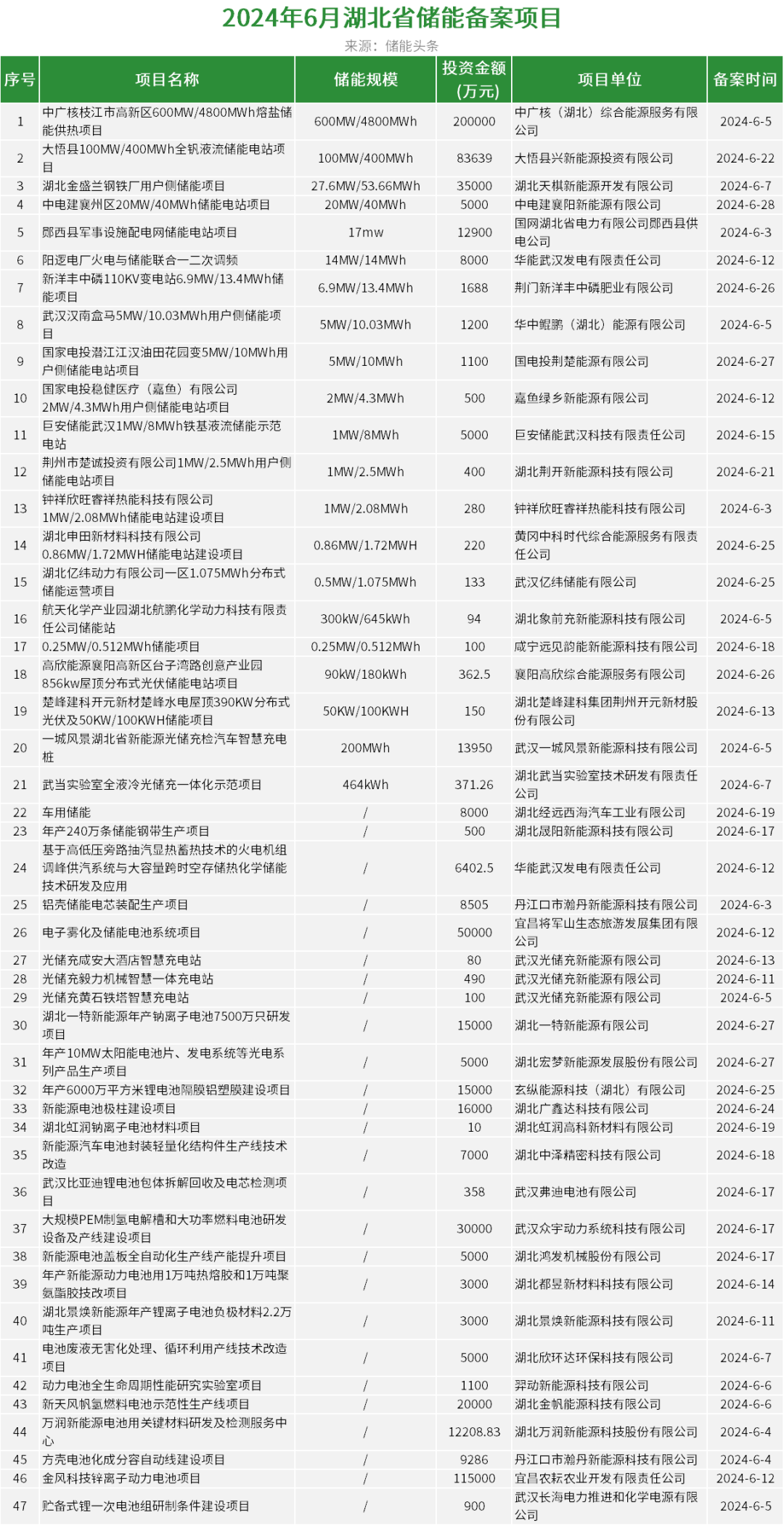 6月湖北省备案储能项目47个,投资金额约70.7亿元,总规模802.55MW/5562.67MWh。
