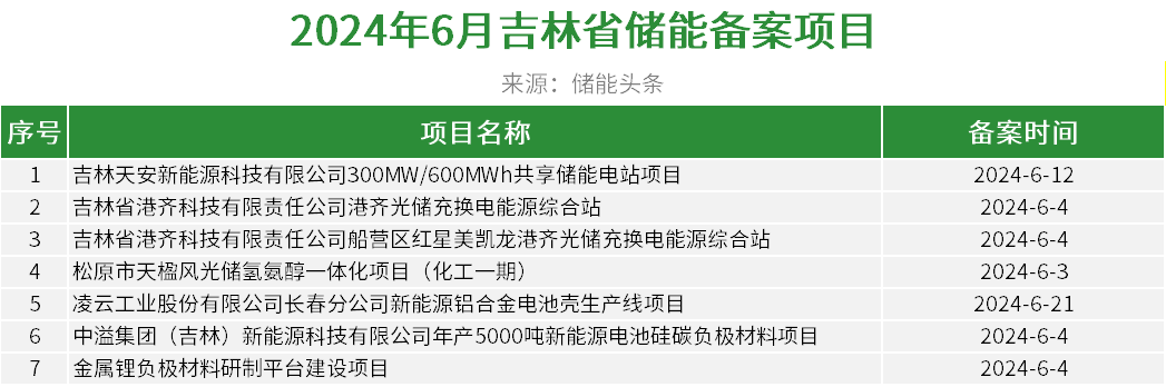 吉林6月备案储能项目7个,有储能项目、电池材料项目等产业项目。