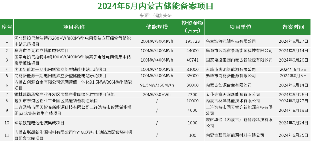 6月内蒙古备案储能项目11个,规模711.5MW/2846MWh,投资额41.08亿元。