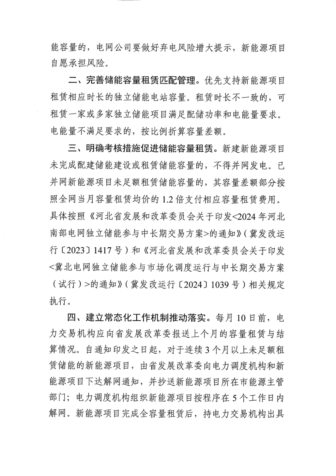 强化统筹支持新能源租赁独立储能容量。为促进新能源配建储能集约、高效、安全发展,自2024年9月30日起,未开工新能源项目需配建储能的,鼓励优先通过租赁方式配置储能,不再单独配建容量低于10万千瓦/20万千瓦时的储能设施。