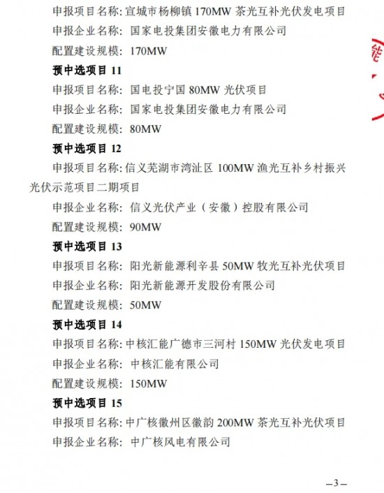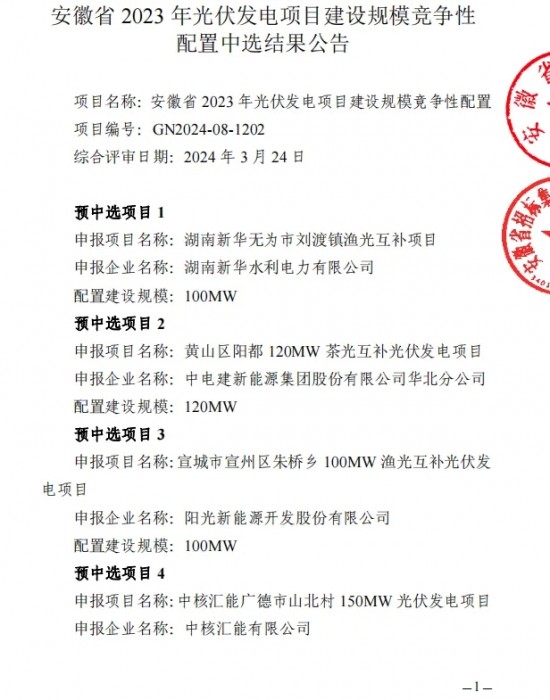 据储能界了解到,近日,安徽省能源局公布了安徽省2023年风、光项目建设规模竞争性配置中选结果公告:阳光电源、中核、中广核、信义光能(香港)有限公司、国家电投等上榜。