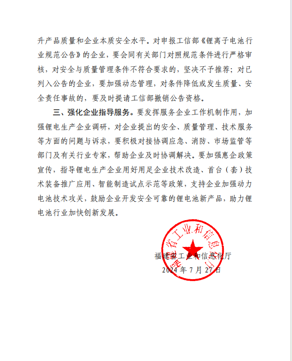 附件:1. 关于加强锂电行业管理有关工作的通知(闽工信函装备〔2024〕428号)