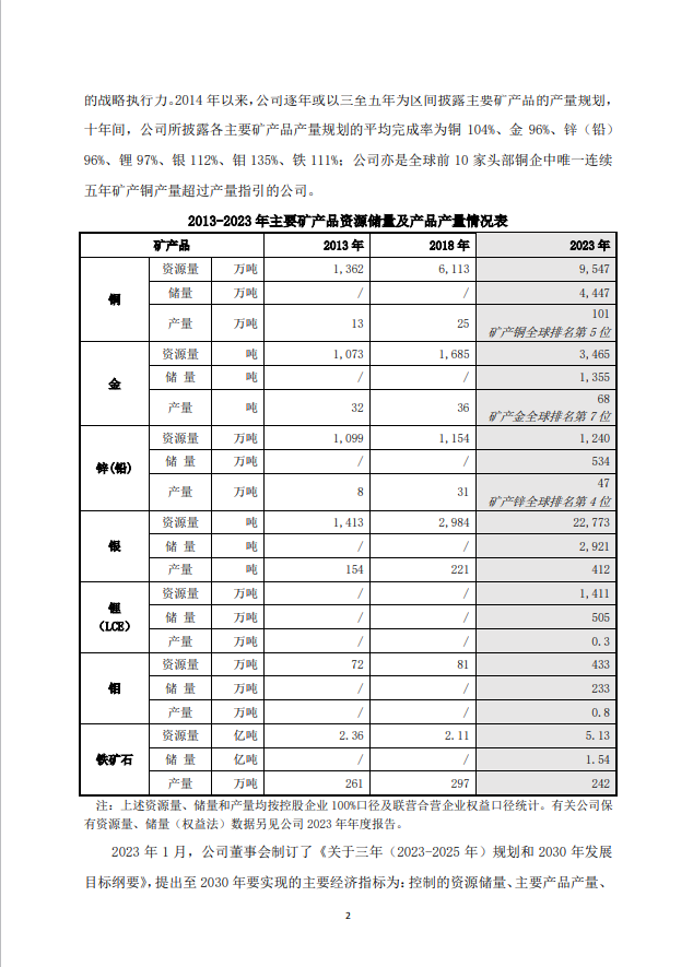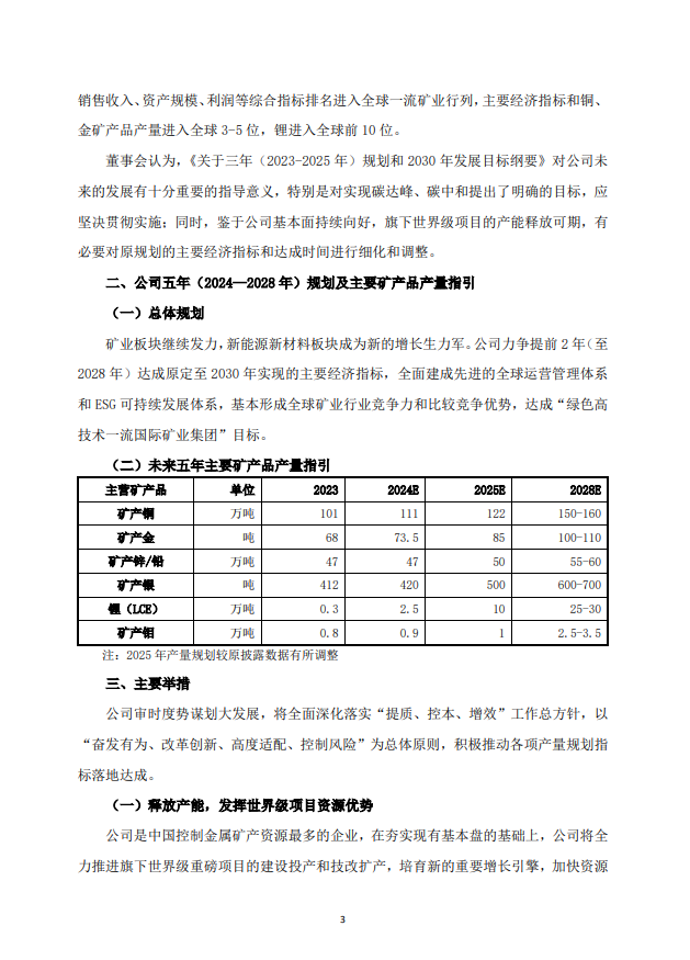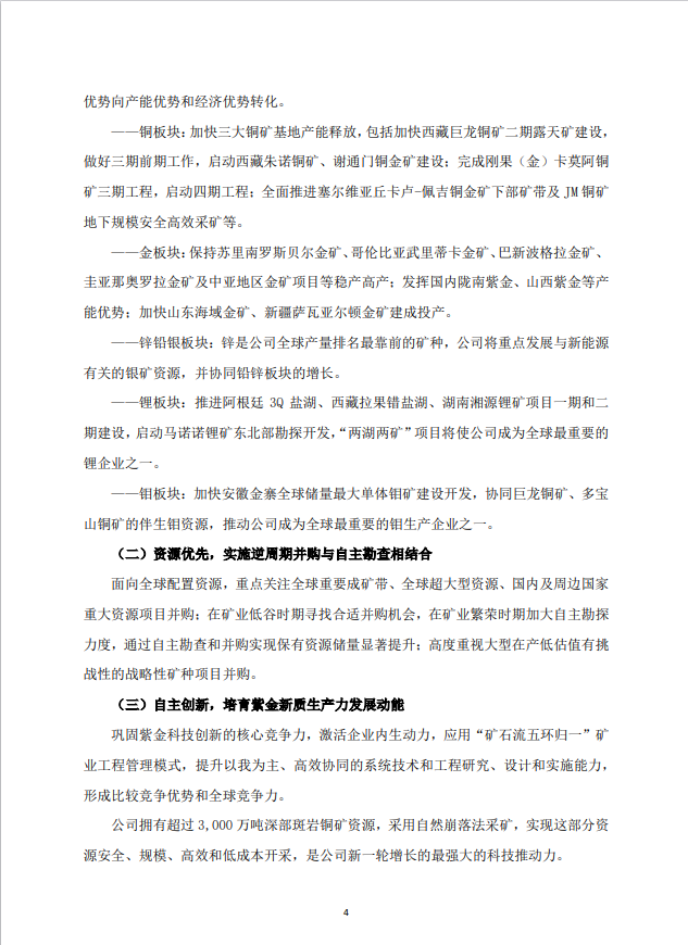 董事会认为,紫金矿业对未来五年主要矿产品产量规划的超前布局具有重大战略意义。作为全球矿业市场的重要参与者,公司拥有一批世界级铜、金、锂、钼矿产资源项目,拥有强劲且持续增长的现实产能,将全力达成新五年发展规划目标,为股东带来更好的回报,为全球经济增长及绿色发展贡献紫金力量!