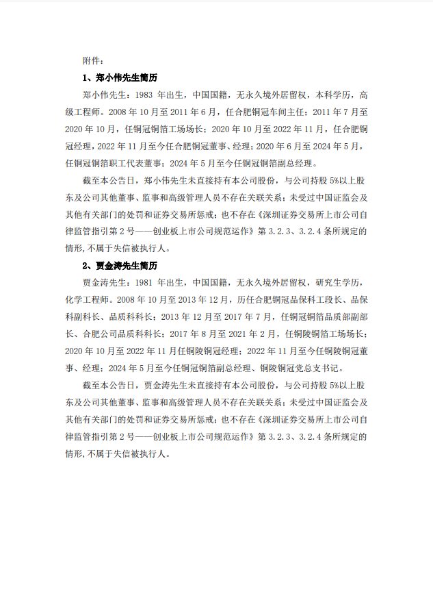 郑小伟先生简历郑小伟先生:1983年出生,中国国籍,无永久境外居留权,本科学历,高级工程师。2008年10月至2011年6月,任合肥铜冠车间主任;2011年7月至2020年10月,任铜冠铜箔工场场长;2020年10月至2022年11月,任合肥铜冠经理,2022年11月至今任合肥铜冠董事、经理;2020年6月至2024年5月,任铜冠铜箔职工代表董事;2024年5月至今任铜冠铜箔副总经理。