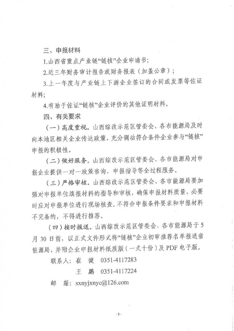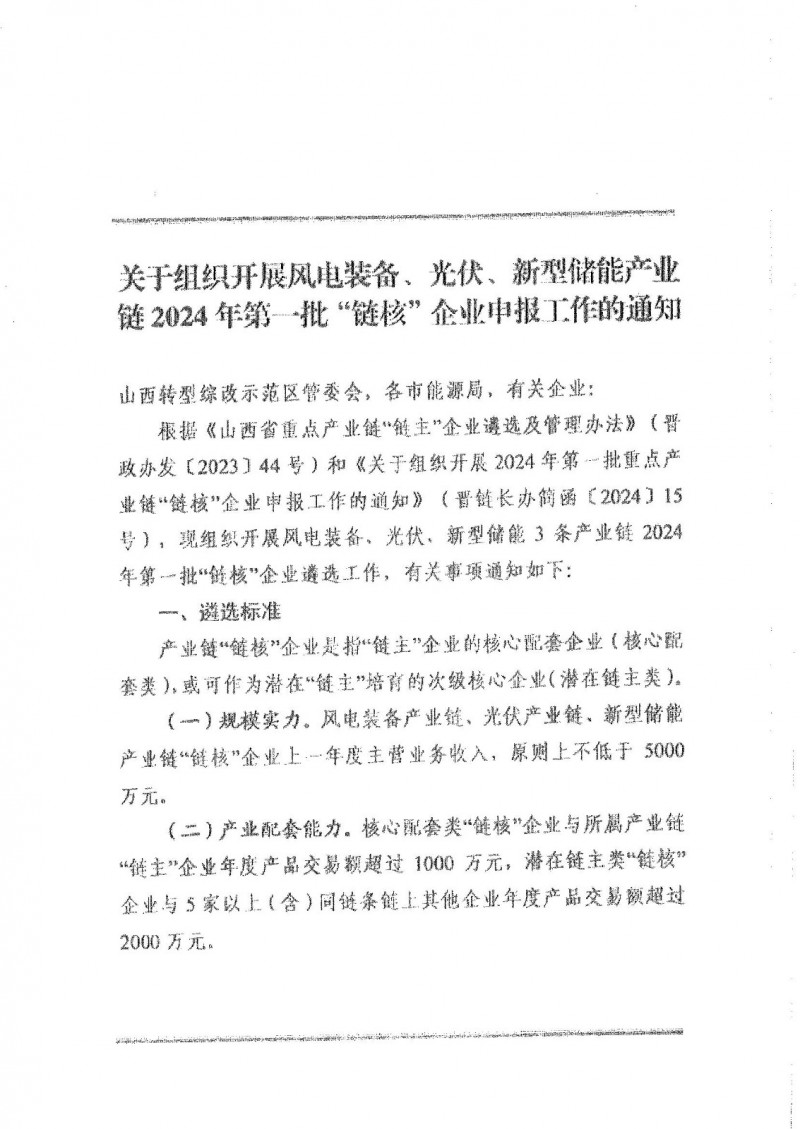 根据山西省能源局《关于组织开展风电装备、光伏、新型储能产业链2024年第一批“链核”企业申报工作的通知》要求,现组织开展申报工作。请各企业根据通知要求,于5月21日前报送申报材料。