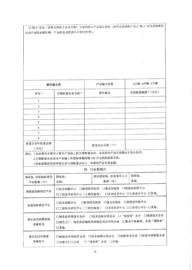 (三)行业影响力。掌握产业链关键技术或具有核心基础产品。获得“国家级小巨人”“国家级制造业单项冠军…“省级专精特新”或“省级小巨人”等称号的企业优先考虑。