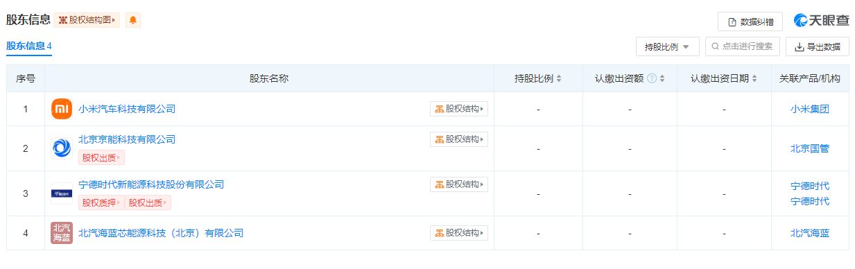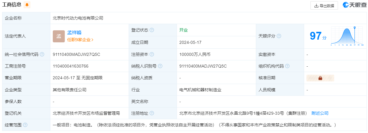 储能界网讯 天眼查App显示,5月17日,北京时代动力电池有限公司成立,法定代表人为孟祥峰,注册资本10亿人民币,经营范围为电池制造。该公司由宁德时代、小米汽车科技有限公司、北汽海蓝芯能源科技(北京)有限公司、北京京能科技有限公司共同持股。