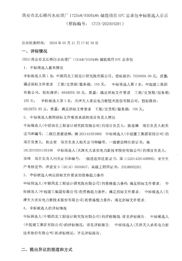 据储能界了解到,近日,陕西省西安市北石桥污水处理厂1725kW/5505kWh储能项目EPC总承包中标候选人公示发布。